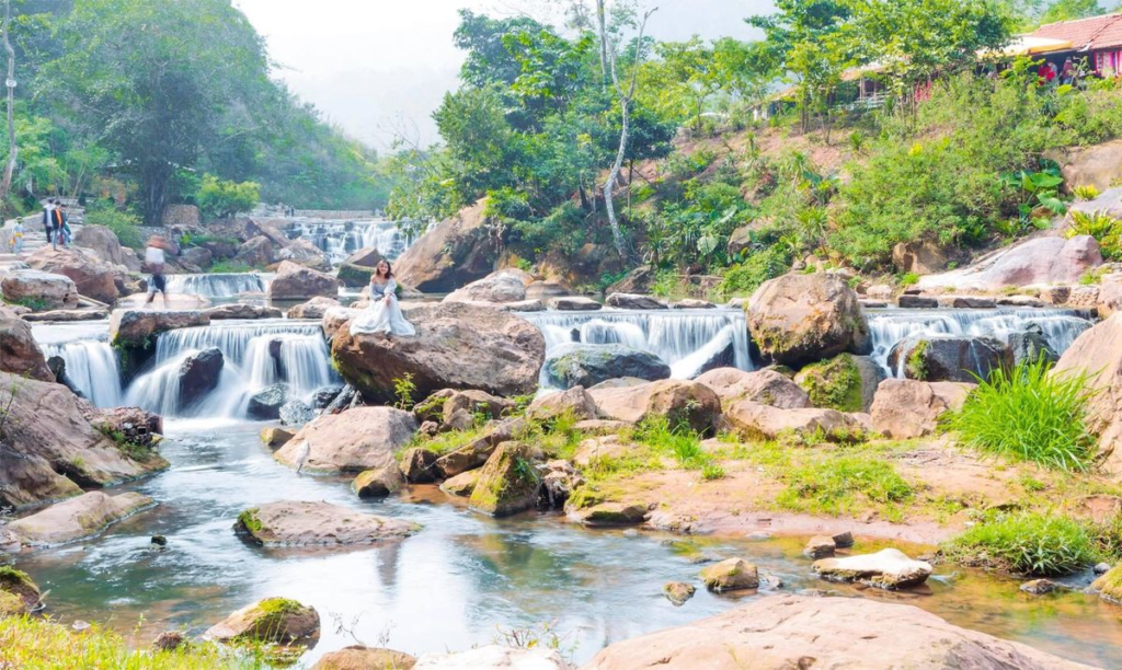 The best time to visit Fairy Waterfall is from March to May, when the weather transitions from spring to summer. The entrance fee is 20,000 VND per person. Motorbike parking costs 5,000 VND per vehicle, while car parking is 20,000 VND per vehicle. In addition to sightseeing and photography, visitors can check in and take photos with a wooden raft at the third tier, with a rental fee of 10,000 VND per person.