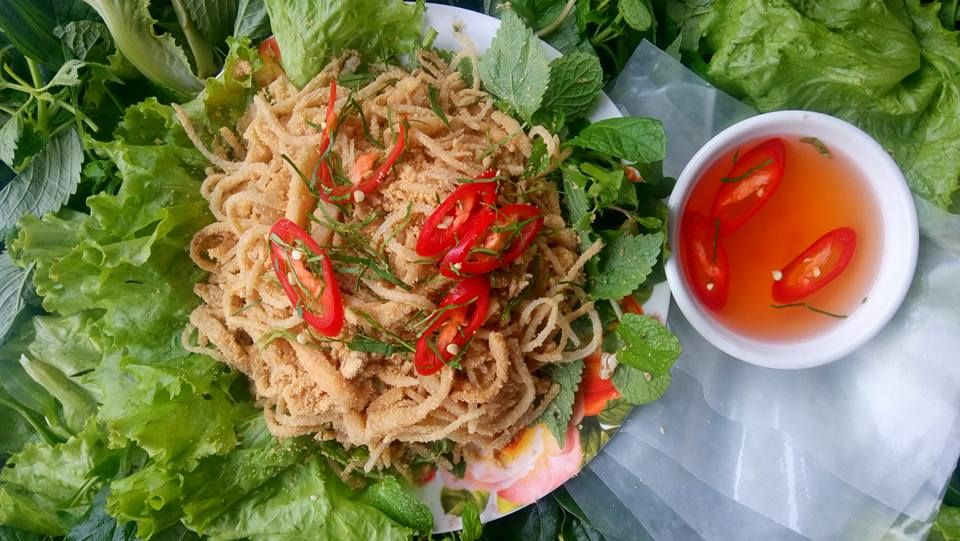 Nem chao, also known as nem thinh, is a rustic Vietnamese dish made mainly from shredded pork skin and roasted rice powder. The ingredients are quite simple: finely sliced pork skin cut into thin strands, mixed evenly with thinh—roasted rice that has been ground into a fine powder. Although the preparation seems straightforward, thanks to unique processing techniques and seasoning secrets, nem chạo becomes an irresistibly flavorful and memorable dish.