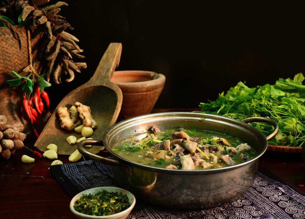 Thang Co is one of the most iconic dishes and holds strong cultural significance among the H’Mong people. Traditionally prepared during festivals, markets, and communal gatherings, this dish represents the spirit of sharing within mountain communities. The stew is slow-cooked using meat, bones, and internal organs, combined with native herbs and spices sourced from surrounding forests.